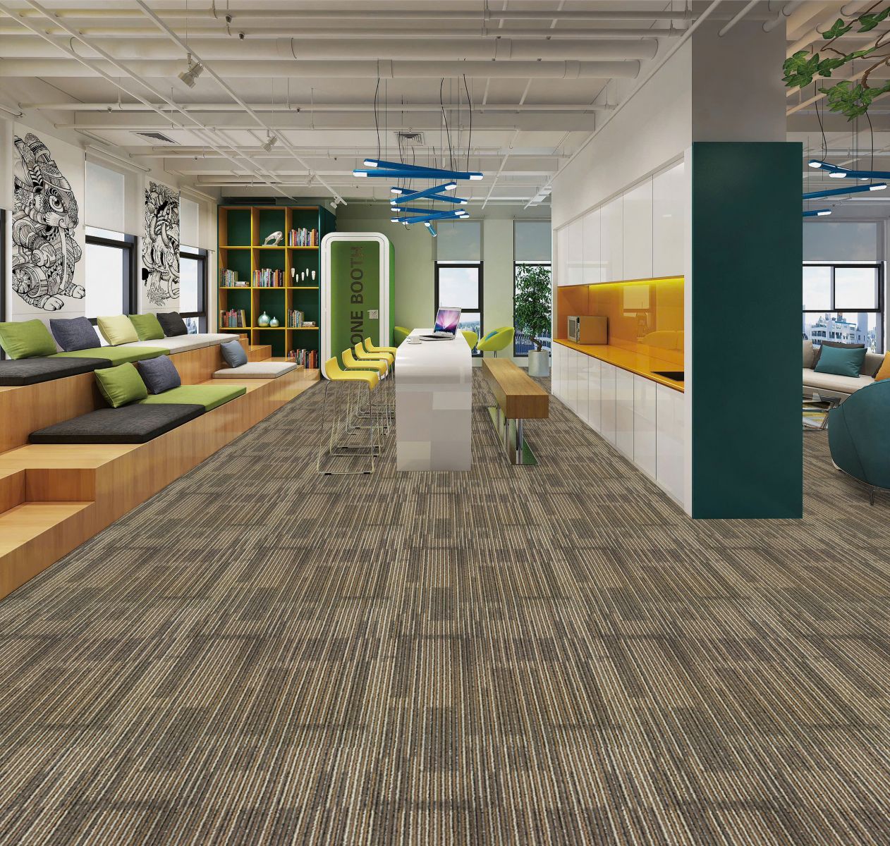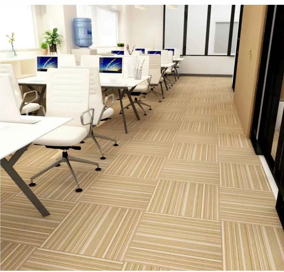 2. Giảm tiếng ồn – Tạo môi trường làm việc yên tĩnhThảm có khả năng hấp thụ âm thanh cực tốt, giúp giảm thiểu tiếng bước chân, tiếng kéo ghế, tiếng vang trong phòng. Môi trường làm việc yên tĩnh giúp nhân viên tập trung và làm việc hiệu quả hơn, đặc biệt trong không gian văn phòng mở.